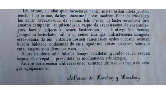 1875eko urtarrilean Bilboko eta Deustuko Udalek agiri baten ale batzuk jaso zituzten. Espainiako Alfontso XII.arena zen, Bizkaiko Gobernadore Zibilak bidali zuen eta… euskara hutsez zegoen!