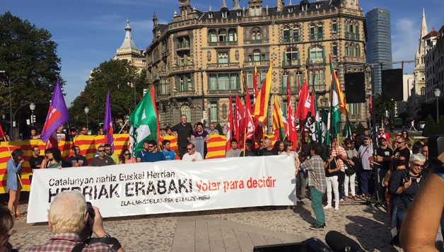 ELA, LAB, ESK, STEILAS, ETXALDE, eta HIRU elkarretaratzeak egin dituzte hiriburuetan. Deialdia ‘Catalunyan nahiz Euskal Herrian, herriak erabaki’ lelopean egin dute. Bilbon Moyua plazan bilduko dira. Bertan, Txiki Muñoz eta Garbiñe Aranburuk, ELA eta LABeko Idazkari Nagusiak, hartuko dute hitza, Kataluniako herriari babesa emateko. Gabiñe Aranburuk esan du Espainiako Estatuak “salbuespen egoera” ezarri duela Katalunian eta “errepresioa” erabiltzen ari dela erreferenduma galarazteko.Txiki Muñozek ere EAJren jarrera hartu du ahotan, eta alderatu egin ditu Katalunian ikusten duen “borondate sendoa” eta Ibarretxe plaza aurkeztu zenean erakutsitakoa.