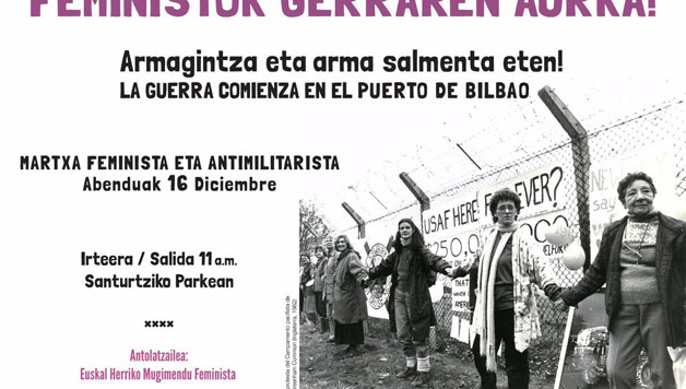 Mugimendu Feministak martxa antimilitarista eta feminista egingo du bihar Santurtzin. Feministok gerraren aurka lelopean. Mugimendu feministak bat egingo du mugimendu antimilitaristarekin, mugimendu feminista historikoki posizionatu da armagintza eta bortizkeria estrukturalen aurka. Greenham Common kanpaldia, antimilitarismo feminista, desobedientzia edota erresistentzia bezalako hitzak entzutean. 80. hamarkadan egindako ekintza hura inspirazio iturri eta memoria historikoari keinu eginez antolatu du Euskal Herriko Mugimendu Feministak martxa feminista antimilitarista abenduaren 16an, Santurtzitik abiatuta.