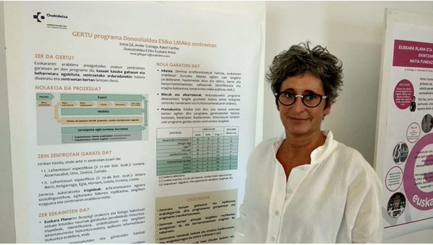 Irene Gil Legarra dugu orain gurekin, Donostialdea Erakunde Sanitario Integratuaren euskara teknikaria da eta “Osakidetzan euskararen erabilera eta presentzia handitzeko praktika egoki batzuk” gaia garatu du  jardunaldian.