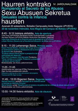 ‘Haurren kontrako sexu abusuen sekretua hausten’ deituriko jardunaldiak antolatu dituzte EHUko Berdintasunerako Zuzendaritzak, Bilboko Hezkuntza Fakultateak eta Gure Sarea elkarteak. Ekimena Bizkaiko kanpuseko Areto Nagusian garatuko da azaroaren 20an. Jardunaldiak, urtero legez, problematika bat aurkezten du: gaur egun 4 neskatotatik batek eta 7 mutikotatik batek abusu sexuala jasan du 13 urte bete baino lehenago. Gainera, kasuen %90ean erasotzailea haurraren familia edo ingurukoa da eta kasuen %2 bakarrik ezagutzen da gertatzen ari den momentuan. Gure Sarea elkarteko Maitane Urizarrek gurekin hitz egin du jardunaldien 4. edizio honi buruz.