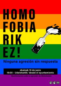 Ekainak 28 Bizkaiko koordinadorak ohar baten bidez  Basaurin  Ekainaren 6an, , izandako eraso homofoboa salatu du. Homofobiarik EZ! erantzunik gabeko eraso bat ere lelopean gaur egingo den manifestazioan parte hartzera dei egin dute. Gertakariak 23 urteko gazte bati gertatu zitzaizkion, goizeko 02:30ean. Gertaera Basauriko Bizkotxalde parkean izan zen, non gaztea bikotekidearekin eta beste lagun batzuekin zegoen.Erasotzaileek eta biktimak ez zuten elkar ezagutzen, eta, erasoa egin aurretik, erasotzaileetako batek “VETE DE AQUÍ, ME DAS ASCO MARICÓN” adierazi zuen. Gainera, lurrean zegoen bitartean, ostikadak ematen zizkioten. Konortea galdu arren ere, jipoiarekin jarraitu zuten.Hori dela eta, gertatutakoa publikoki salatzen dute, eta  erabateko gaitzespena adierazten dute mota guztietako eraso diskriminatzaileekiko.