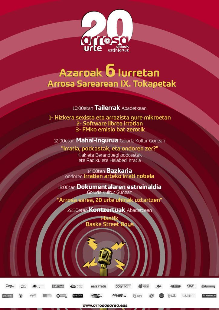 Arrosa sarean 20 urte bete ditu eta larunbatean topaketak antolatu ditu Iurretan. 25 Irratik osatzen dute Arrosa sarea, irrati libre, komunitario edo udal irratiak osatutako sarea hizkuntza dute komunean, euskara. Saioen elkartrukea egiten dute, astero 60 saio sareratzen dituzte, denetariko gai eta formetan. Larunbaterako egitarau interesgarria antolatu dute, lehenago, goizeko 10:00etan, hiru tailer egingo dira aldi berean Abadetxea gaztetxean: hizkera sexista eta arrazistari buruzkoa bat; irrati bat software libreaz martxan jartzeko urratsez bestea, eta FMko emisio bat nola egin erakutsiko duena hirugarrena. 12:00etan, bestalde, podcasten inguruko mahai-ingurua egingo da; Beranduegi eta Klak-gazte ahotsa saioetako, eta Ondarruko Radixu eta Gasteizko Hala Bedi irratiko kideek parte hartuko dute.