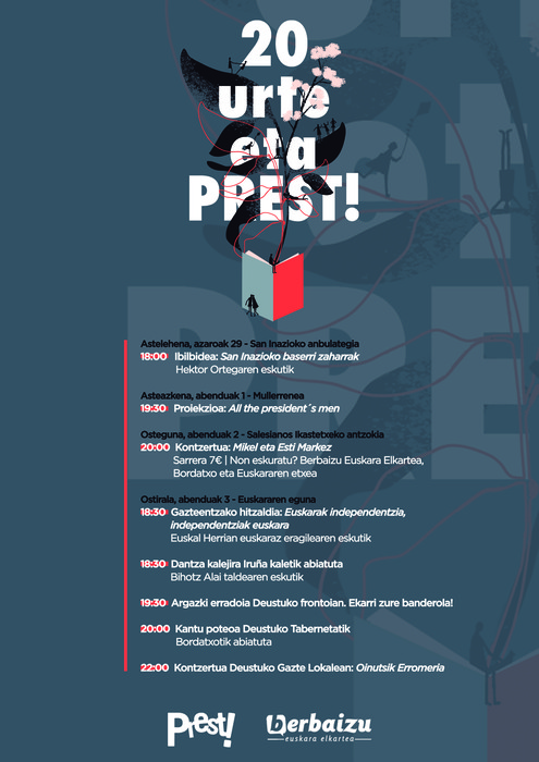 Euskara eta kultura ardatz izango duten hainbat hitzordu prestatu dituzte Deustualdeko Prest! aldizkariak 20 urte bete dituela ospatzeko. 2001eko martxoan jaio zen Berbaizu euskara elkartearen eskutik, eta ordutik hurbileko informazioa euskaraz helarazten du hilero etxez etxe. Datorren astelehenean abiatuta hainbat ekitaldi antolatu dizute irakurle eta auzokideekin gozatzeko.