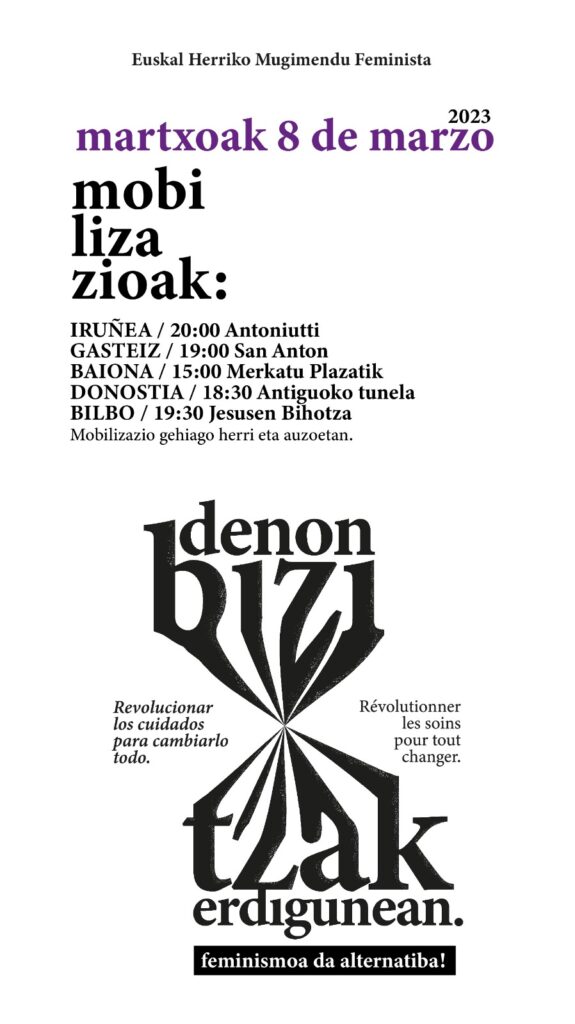 Zaintza eredua eraldatu, dena aldatzeko. Hori aldarrikatuko du Euskal Herriko Mugimendu Feministak heldu den Martxoaren 8ko mobilizazioetan. Ohi bezala, manifestazioak egingo dituzte Euskal Herriko auzo, herri eta hiriburu gehienetan. Bilbokoa 19:30ean abiatuko da Jesusen Bihotzetik. Mugimendu feminista Denbora darama salatzen emakumeok* bizi ditugun esplotazio egoerak, baina, egoera hori kolapsatzen ari da. M8-an zaintza sistema heteropatriarkala suntsitzeko, EHko kaleak hartuko ditugu, antolakuntza eta autodefentsa feminista direlako ditugun tresna eraginkorrenak.
