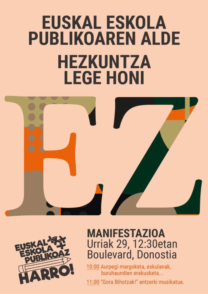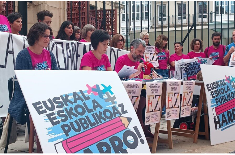 Euskal eskola publikoaren alde, hezkuntza lege honi ez! lelopean deitu dute manifestazioa. Gaur legebiltzarreko atarian hezkuntza lege proiektuari erabateko aurkako jarrera agertu dute. Hautatu duten leloak ongi laburbiltzen du plataformak Hezkuntza Lege proiektuarekin duen kezka. Uste du legeak pribatua bultzatzen duela eta ez duela konponduko hezkuntza sistema duala. Are gehiago pribatua betikotu egingo duela. Euskarari dagokionez ez du ikasle guztien hizkuntza gaitasuna bermatzen. Hizkuntza indartu nahi bada eskola publikoa indartu behar dela azpimarratu dute. Arantzak eman dizkigu xehetasun guztiak.