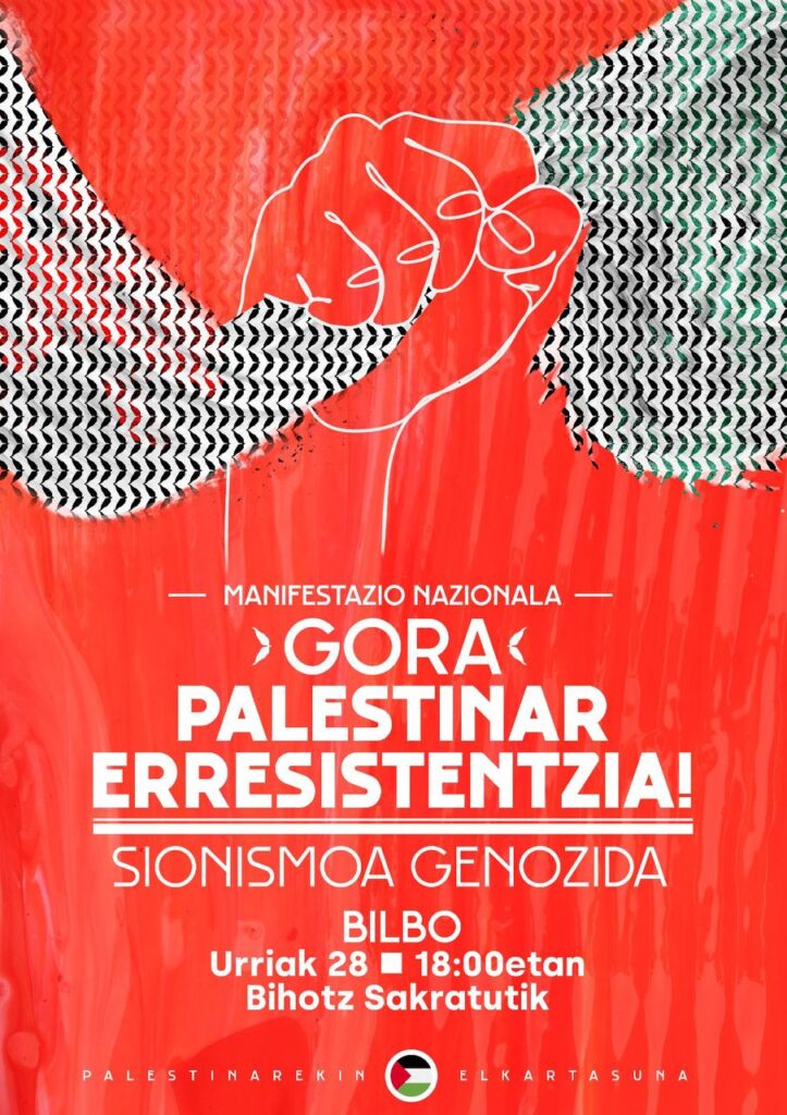 Euskal Herriko hainbat kolektibok Palestina Elkartasuna ekimena aurkeztu dute eta manifestazio nazionala deitu dute hurrengo larunbaterako Bilbon. Gaur aurkeztu duten manifestuan, baieztatu dute egun hauetan Palestinan gertatzen ari dena Palestinako Estatu sionistaren 75 urteko kolonialismo, apartheid eta garbiketa etnikoaren eta Gazako zerrendaren aurkako blokeoaren testuinguruan bakarrik irakur daitekeela. Datorren larunbatean, Jesusen Bihotza plazatik manifestazioa deitu dute.
