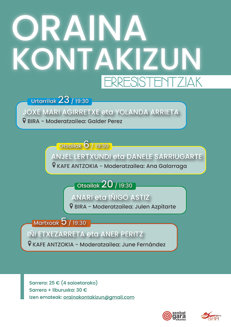 Oraina kontakizun jardunaldien edizio berria izan dugu hizpide Lutxo Egia eta Marta Zumetarekin. “Erresistentzia” kontzeptuari erreparatuko diote solasaldiek ea, iazkoek errelatua aztertu zuten moduan, euskal sortzaileak binaka gonbidatuta, aurten berriro bakoitzak bere ikuspuntutik garatuko du gaia. Lehen edizioan bezala, lau saio izango dira, urtarrilaren 23a eta martxoaren 5a bitartean, bi Kafe Antzokian eta beste bi Bira kulturgunean. Euren jardunean topatzen dituzten erresistentzietan murgilduko dira hizlariak, kontzeptua ulertzeko bi eratatik ikusita: batetik traba edo oztopo moduan ulertuta, baina baita irauteko eta izateko senetik eta gogotik begiratuta ere.