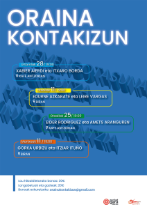 Itxaro Borda, Xabier Aierdi, Eider Rodriguez, Amets Aranguren, Edurne Azkarate, Leire Vargas, Itziar Ituño eta Gorka Urbizu izango dira aurtengo gonbidatuak. Urtarrilaren 28tik martxoaren 11ra, Bilboko Zenbat Gara elkarteak eta Bira kulturguneak Oraina kontakizun (III): “Lurralde deserosoak” jardunaldiak antolatu dituzte. Marta Zumeta eta Lutxo Egia izan ditugu gurekin.