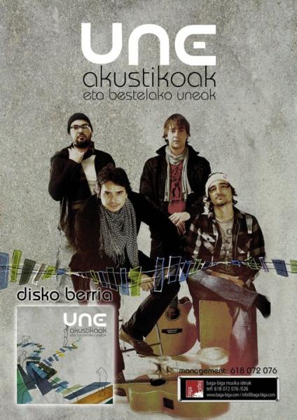 UNE (Une Nare Eza) taldeak “Akustikoak eta bestelako uneak” (Baga-Biga,2010) izeneko lan semi-akustiko fin eta ederra kaleratu du; euren rock doinuak hustu eta saxo, piano eta rhodes zertzeladekin jantzi dituzte; Aitor Uriarte (Latzen,Sen) kantaria eta Ruben G. Mateos teknikaria izan ditugu gure estudioan. Une gozoak igarotzeko musika. Arg:Joseba Barrenetxea
